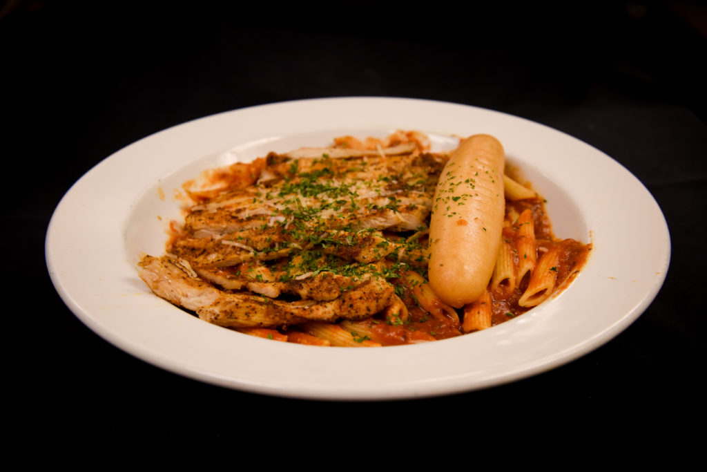 Flavorful marinated grilled chicken on a bed of penne pasta covered with a delicious Marinara sauce